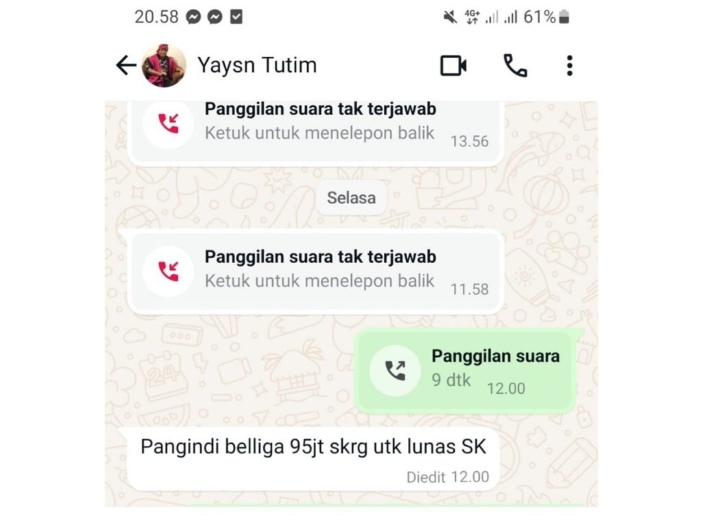 Tangkapan layar itu juga memuat sebagian percakapan berbahasa Wewewa yang berbunyi: “pangindi belliga sekarang untuk lunas Surat Keputusan (SK)”. Berarti “kirim uang dulu sekarang Rp95 juta untuk melunasi SK”.